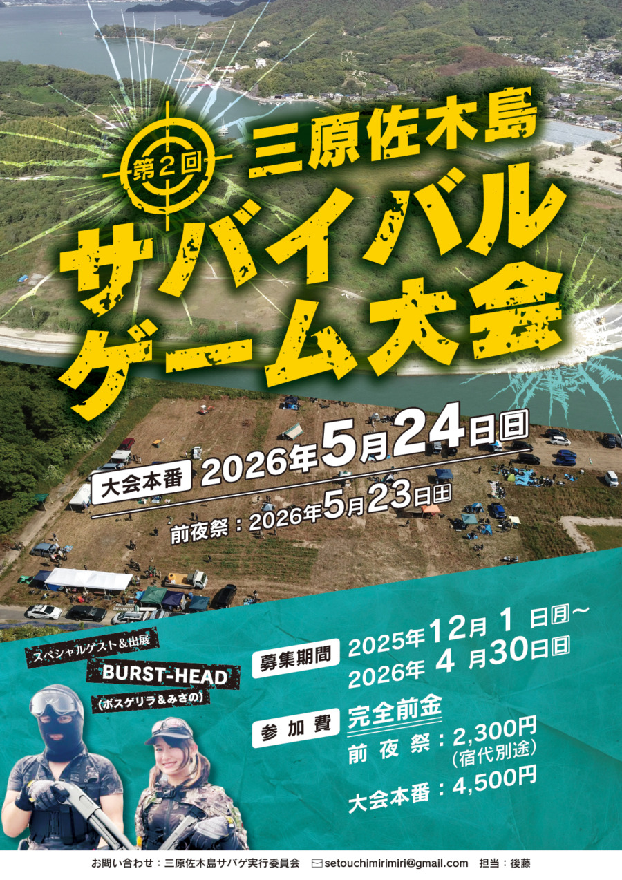 2026年5月23日(土)および24日(日)、瀬戸内海に浮かぶ広島県三原市の佐木島にて、待望の「第2回 三原佐木島サバイバルゲーム大会」が開催される。