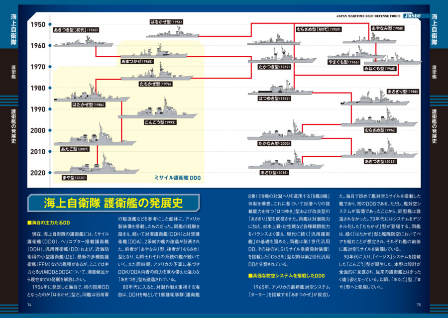 さらに戦車・装甲車、護衛艦、戦闘機は、自衛隊創設時から現代までの発達の流れをイラスト付きチャートで解説、時代背景を踏まえて、それぞれがどのように進化してきたかを知ることができます。